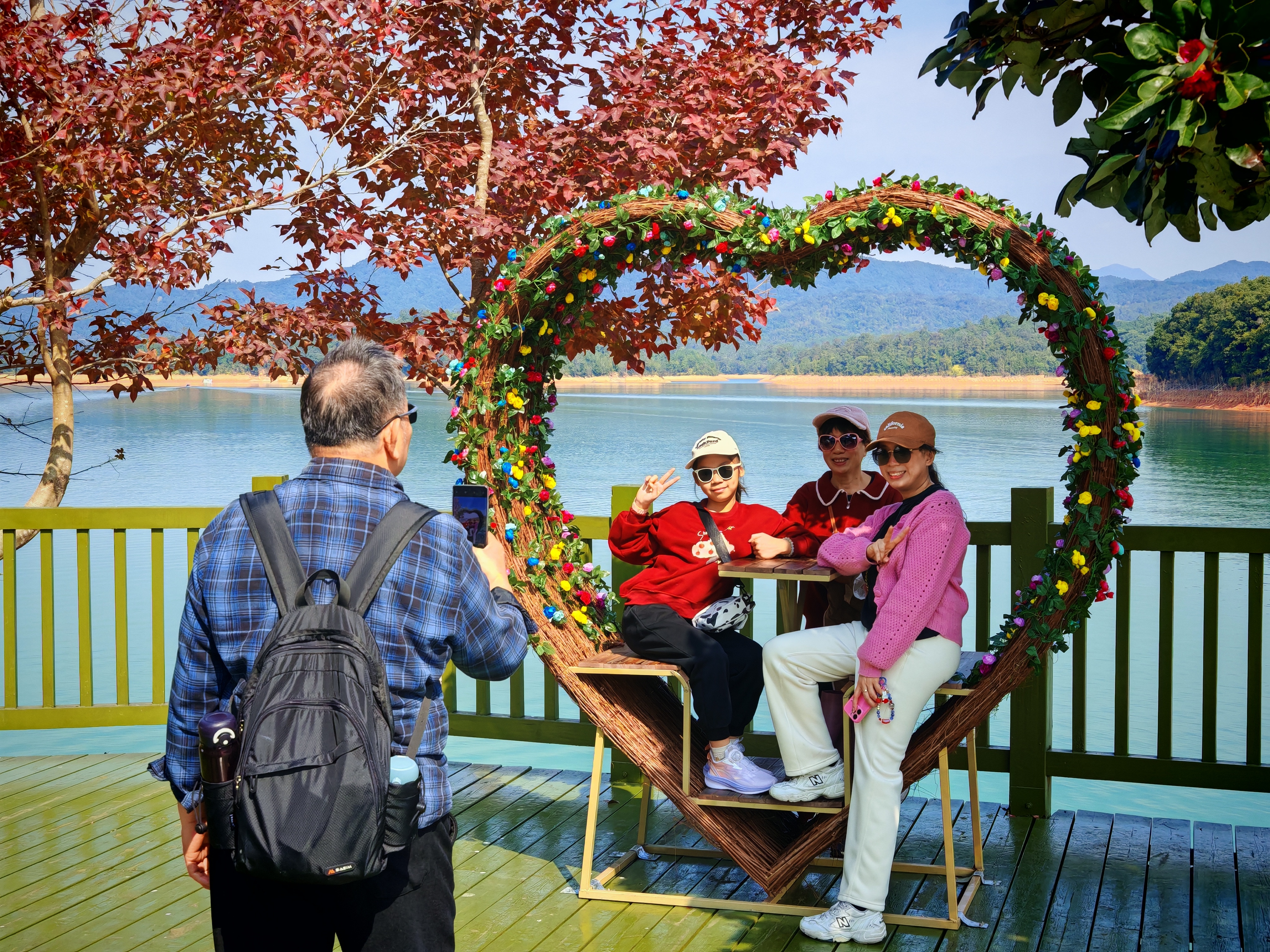 风铃广场周边,铁冬青、火焰木、首冠藤等植物长势良好,风铃声响与自然之声相互交融。沿途远眺,碧波万顷的水库风光与层叠新绿相映成趣,成为摄影取景的热门地点。
